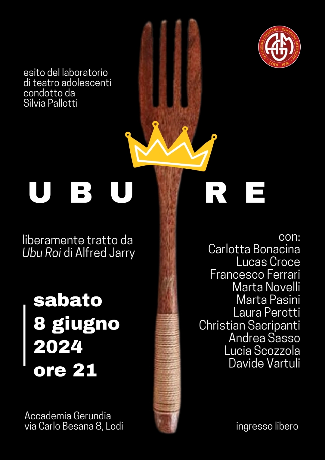 L’Accademia Gerundia di Lodi è lieta di annunciare lo spettacolo teatrale “UBU RE.” Questo evento, liberamente tratto da “Ubu Roi” di Alfred Jarry, promette di incantare il pubblico con una performance unica. Lo spettacolo è realizzato dagli allievi del laboratorio di teatro dell’Accademia Gerundia e condotto dall’attrice Silvia Pallotti. Non perdete questa straordinaria occasione di godere dell’arte teatrale.