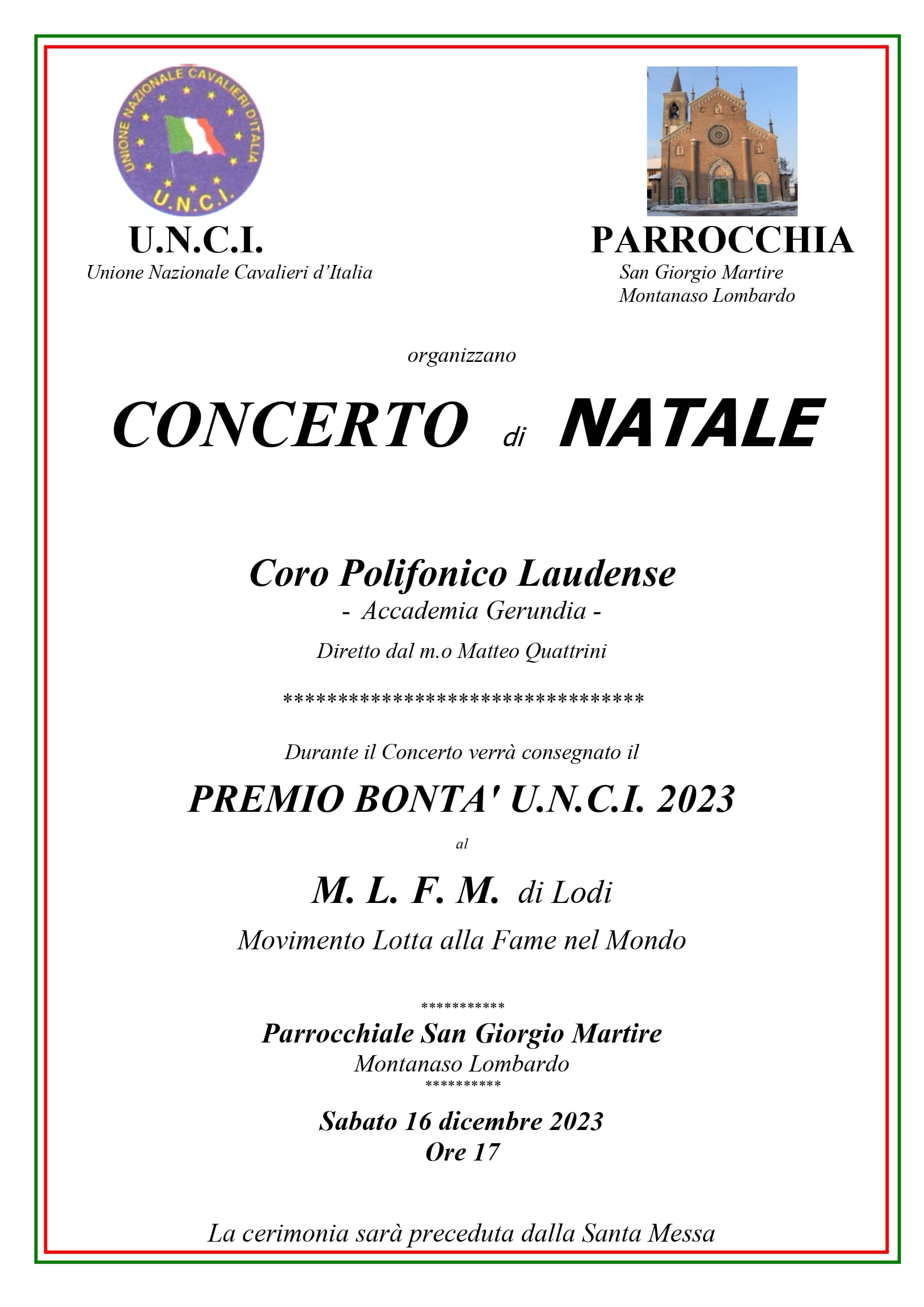 L'atmosfera natalizia si unisce alla generosità umana in un evento straordinario organizzato dall'Unione Nazionale Cavalieri d'Italia (U.N.C.I.). La Parrocchia San Giorgio Martire a Montanaso Lombardo sarà il palcoscenico di un indimenticabile concerto di Natale, in programma per Sabato 16 dicembre 2023 alle ore 17.