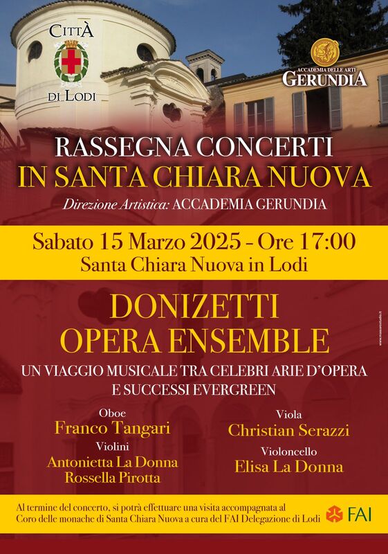 Al termine del concerto, il pubblico avrà l’opportunità di partecipare a una visita guidata al Coro delle monache di Santa Chiara Nuova, a cura del FAI – Delegazione di Lodi.